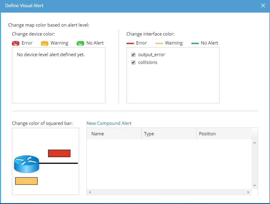 2)Specify which variable change will cause the device or interface color change. You can select multiple variables. 3)If you want to set complex conditions to involve multiple variables, you can click New Compound Alert to define Compound Alert. a)Specify the Compound Alert type between Device and Interface. b)Set conditions for variables. See Defining Alert for more details. c)Enter the alert messages and select the alert level. d)Click OK. 4)Repeat step 3) to add more Compound Alerts. 5)Click OK. 6)Select a position for compound alerts on a map. |