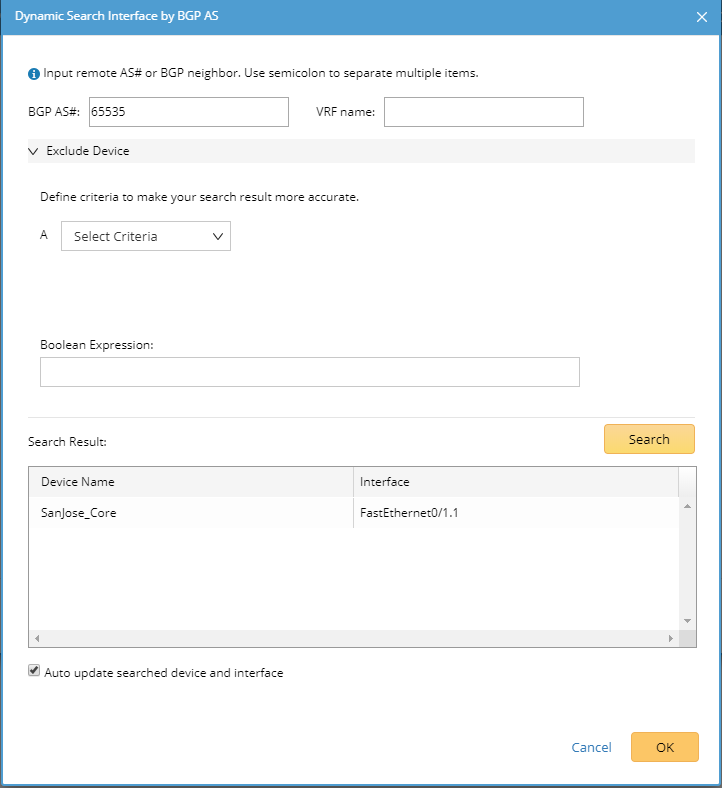 1)Click Dynamic Search Interface. 2)In the pop-up dialog, select By BGP AS (autonomous system) to add edge devices and interfaces based on BGP AS number and VRF. Tip: You can also select By Advanced Search in the pop-up dialog and use the Advanced Search function to find the edge devices and interfaces. 3)Enter BGP AS number and VRF name. Tip: VRF is used to establish the correct connections if some devices have duplicated IP addresses. You can enter multiple VRF names and use semicolons (;) to separate them. Interfaces that have the matched VRF names will be searched out. If you don't want to use the VRF name as a condition to filter interfaces, left it empty; if you want to search interfaces without VRF configured, enter 'global' (single quotes must be included). Tip: Through a specified BGP AS number, a device that meets all of the following conditions will be added as a CE device: - The devices not only configured with EBGP Neighbor but also pointing to the defined AS number. - The non-loopback interface in the same network segment with EBGP Neighbor IP configured on the device. - The neighbor IP of CE devices does not exist in the domain. 4)Click Search. Tip: To exclude specific devices from the search results, you can define more filter criteria. Tip: To automatically synchronize the list of edge devices and interfaces with your live network, you can select the Auto update searched device and interface check box. 5)Review the search result, click OK. |