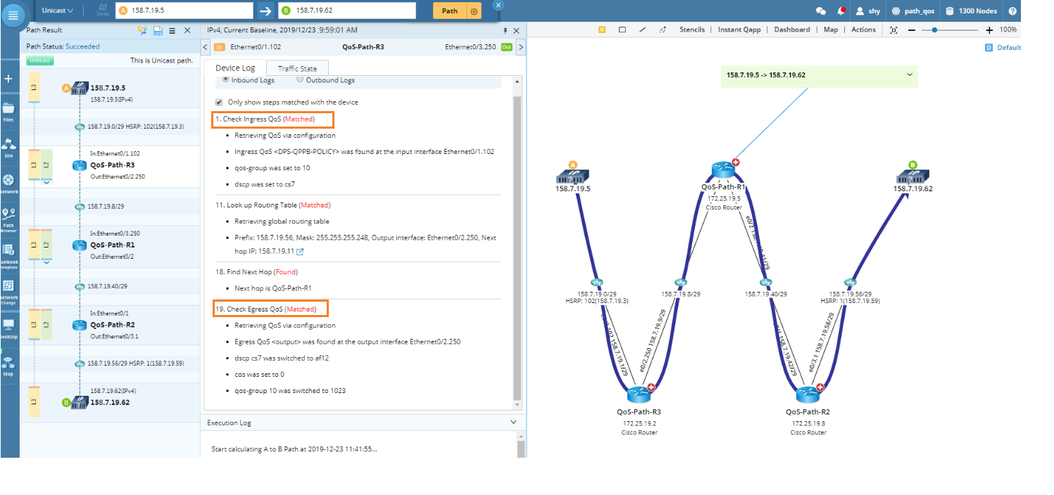 The following is a sample QoS path calculated in the system. The system checks the ingress and egress QoS information at each hop and calculates the path based on QoS policies.