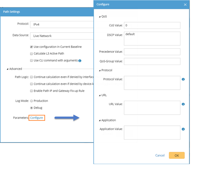 Log in to the device instantly to retrieve live data. ▪Use configuration in Current Baseline (default option) — use the configuration files that have been saved in Current Baseline, not real-time configuration data. ▪Calculate L3 Active Path — calculate the Layer 3 path by using live data. With this option selected, the system calculates the exact path between Cisco IOS devices (including Cisco IOS Routers, Cisco IOS Switch, and Cisco IOS XR) by inquiring the CEF table instead of load-balancing ▪Use CLI command with arguments — use commands with configured parameters (such as show ip route 1.1.1.1) instead of retrieving the complete route table (show ip route), MPLS VPNv4 Label table, and MPLS LFIB table (except for Cisco IOS XR). |