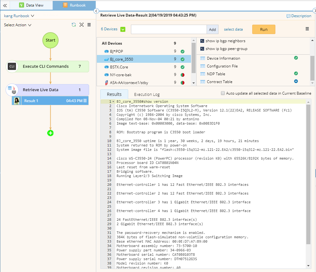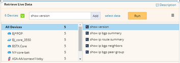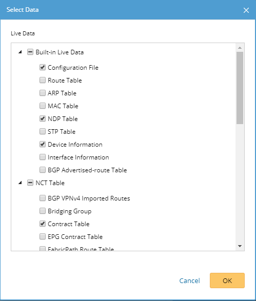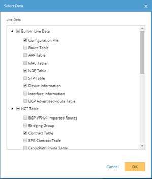 Retrieving live data automation action is used to retrieve device data by executing specified CLI commands and selecting built-in data types, such as configuration files, device and Interface information, Route/ARP/MAC/NDP/STP table, BGP advertised-route table, and NCT table. When retrieving live data, the system attempts to access devices by using Telnet/SSH first with the credentials configured in the Network Settings, and then issues CLI commands to retrieve data.