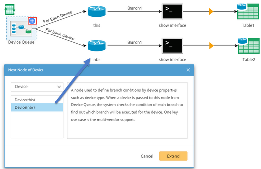 4.Repeat step 1 to 2 to extend a CLI node from the nbr node and define the CLI command node. Extend a Table node from the nbr CLI command node and export intf, mtu, and bw to the Table node (Table2 in this example).