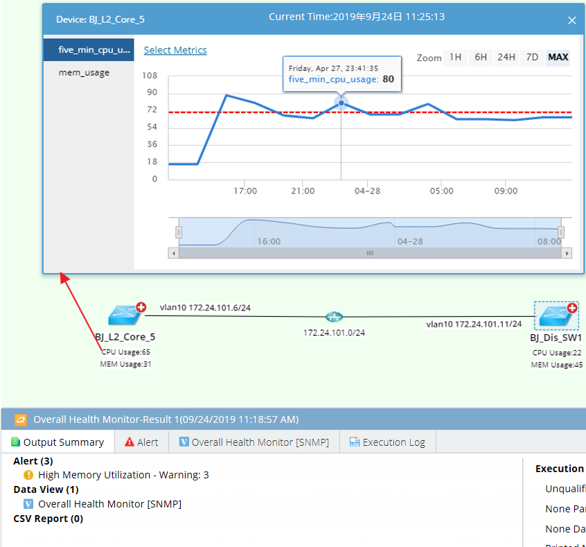 4.Click a numeric value on the map. A floating chart prompts as follows, displaying the monitoring metrics of this device during a period.