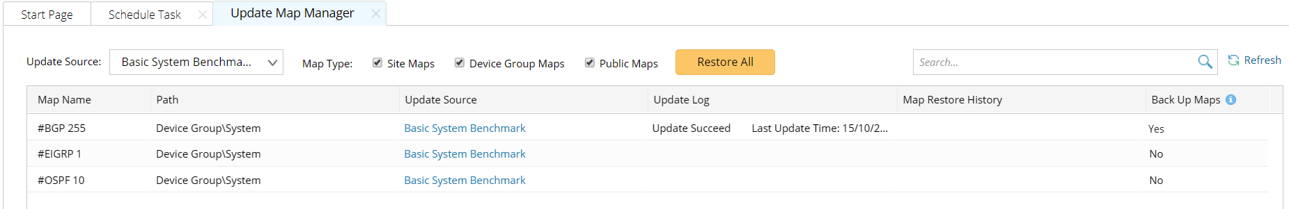3.On the Update Map Manager tab, all the maps updated through benchmark tasks are listed. You can click a link in the Update Source column to go to the benchmark task.