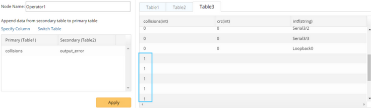 The Append operator is used to append the variable values of a table to the specified column of another table. It is only applicable when the two device data tables are from the same Device node.