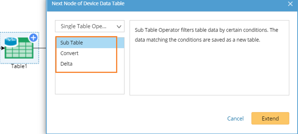 The Sub Table operator filters table data by customized conditions. The data matching the conditions are saved as a new table.