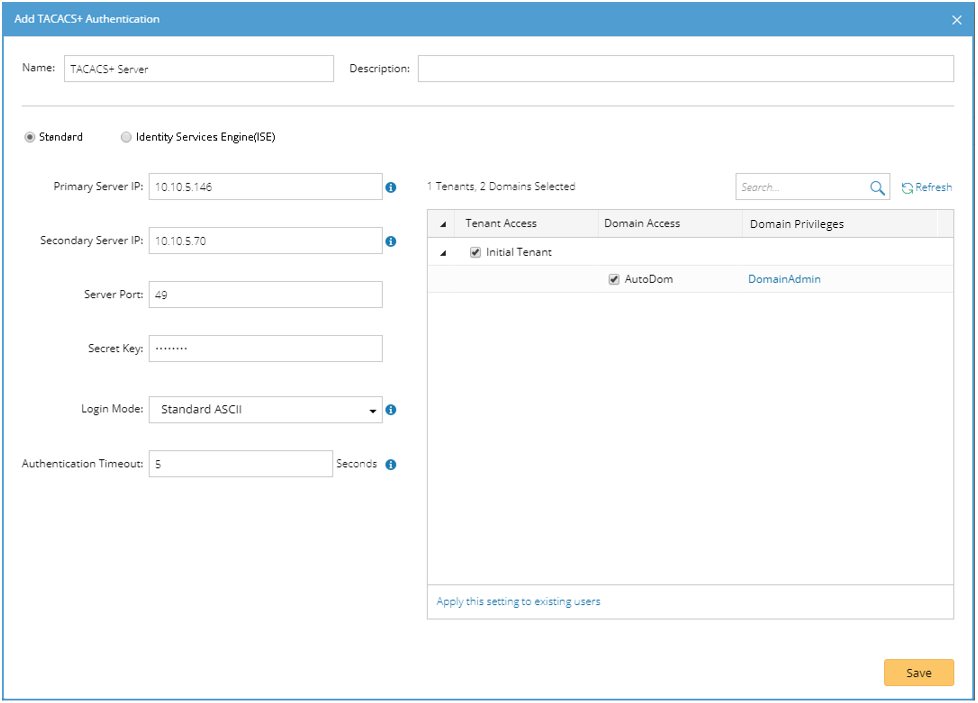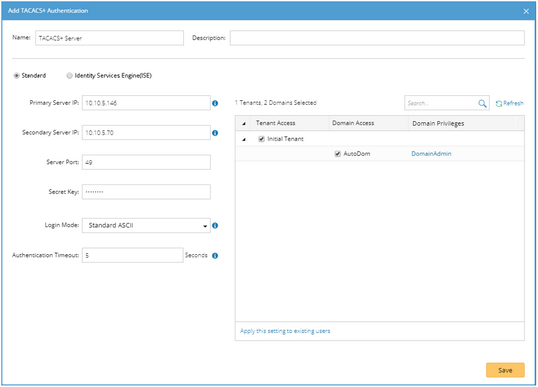 3)Enter the required credentials and parameters to connect to the TACACS+ server. See TACACS+ Server Parameters for more details.