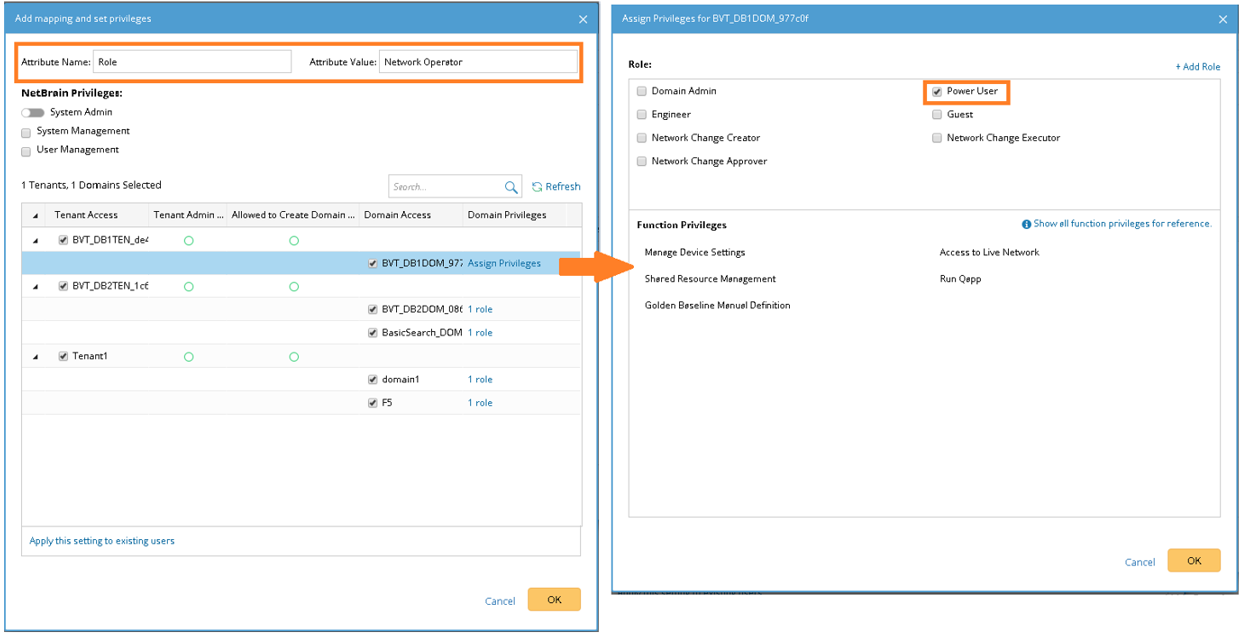 For example, you have two roles (Network Operator and Default View) defined as above, and you want to map them respectively to NetworkBrain roles “Power User” and “Engineer”.