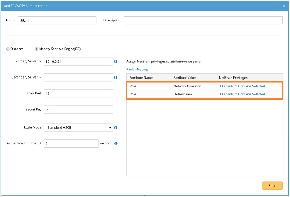 Note: By using an ISE TACACS+ server profile for authentication, the system can assign NetworkBrain roles and privileges to each attribute-value pair configured on the ISE TACACS+ server. Thus, external user accounts can keep finer-grained roles and privileges in good shape before the first-time login in the NetworkBrain system.