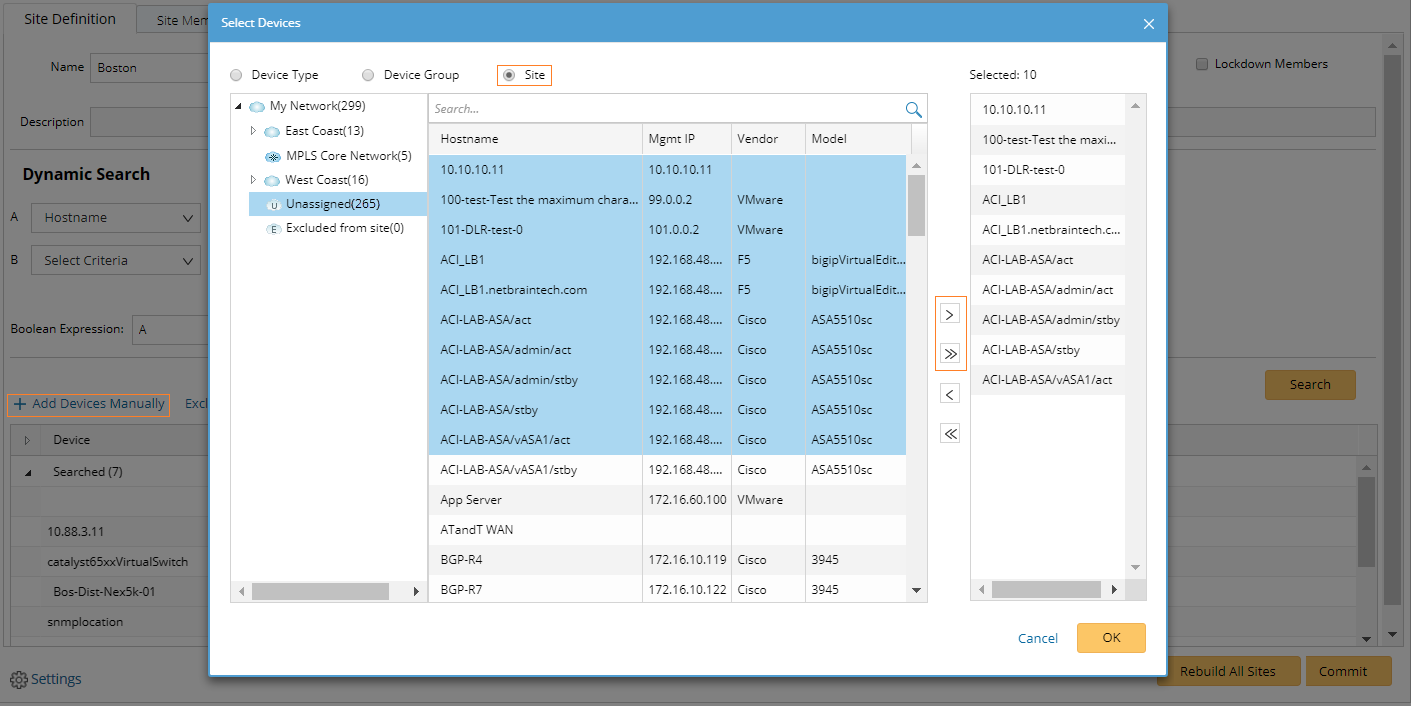 ▪Manually Add — click Add Devices Manually. Under the Site option, click Unassigned and then select target devices.