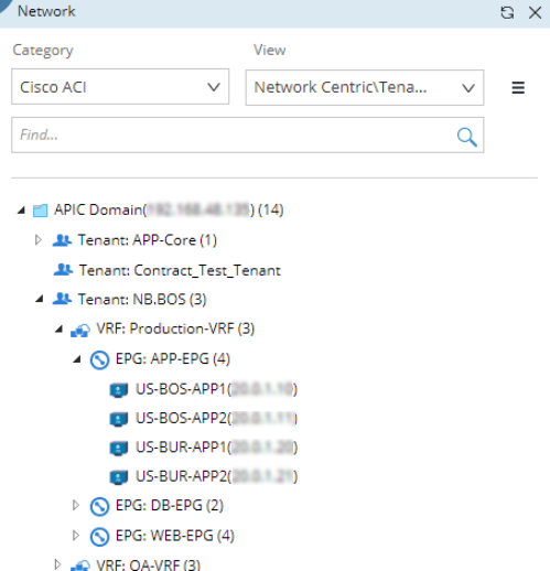 2.In the Network pane, select Network Centric View > Tenant View. The ACI data model is organized in this order: Tenant > VRF > EPG (Endpoint Group) > Endpoint