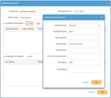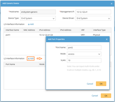 1)In the Add Generic Device pane, enter the hostname and management IP, and select the device type from the drop-down list. The device driver is automatically selected based on the device type.