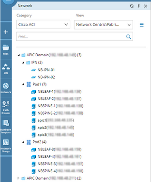 After your ACI network data is discovered and the benchmark task is performed in your domain, the data model is organized in the Network pane.
