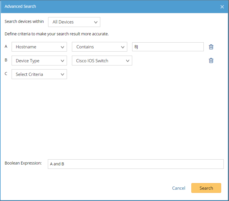 Advanced search allows you to build complex search queries to search for devices by using multiple search criteria and a boolean expression.