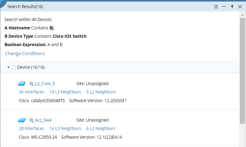 ▪Device Property — use one or more device properties to find devices. ▪Interface Property — use one or more interface properties to find devices. ▪Module Property — use one or more module properties to find devices. ▪Config File — use texts in the configuration file to find devices. ▪Front Server — use a Front Server or Front Server Group to find their managed devices. |