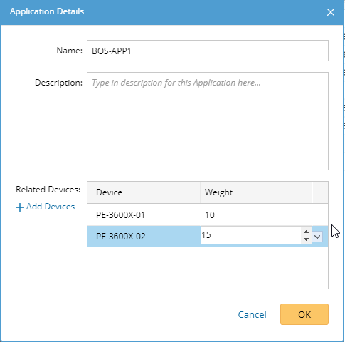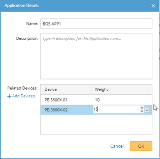 The device weight of an application is the sum of the weights of all devices involved in the application. When assigning devices to an application, you can manually assign a weight to each device.