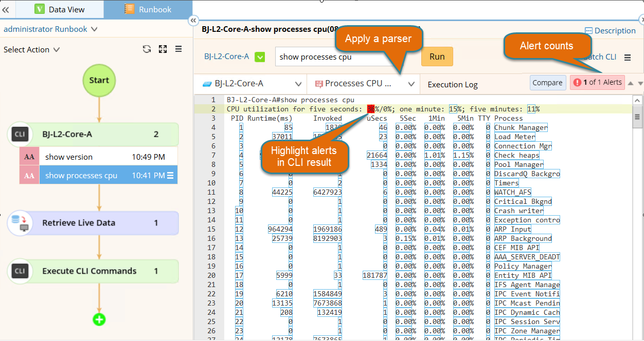 1.Apply a parser in the CLI Command node. The system automatically compares the data retrieved by the parser with Golden Baseline and generates alerts and highlights for any data unit that deviates from the Golden Baseline in the result pane.