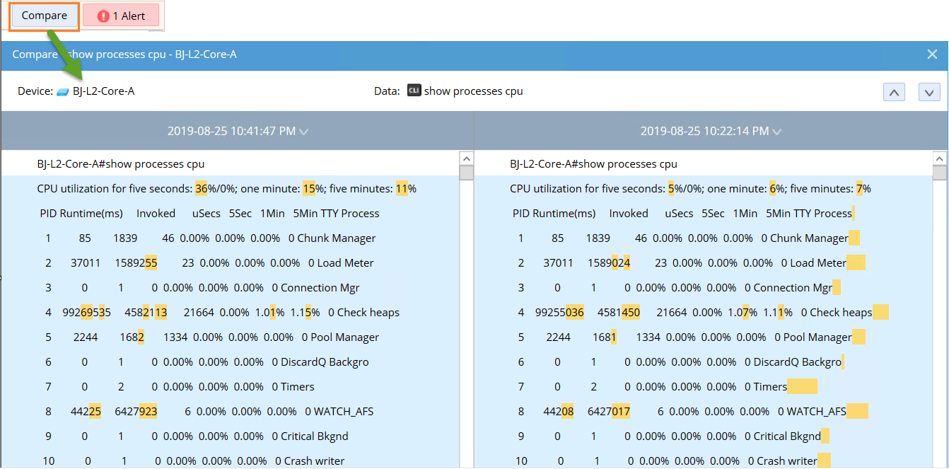 2.Select the time point for comparison. The system will compare the differences between the command results at the two-time points. The differences are highlighted.