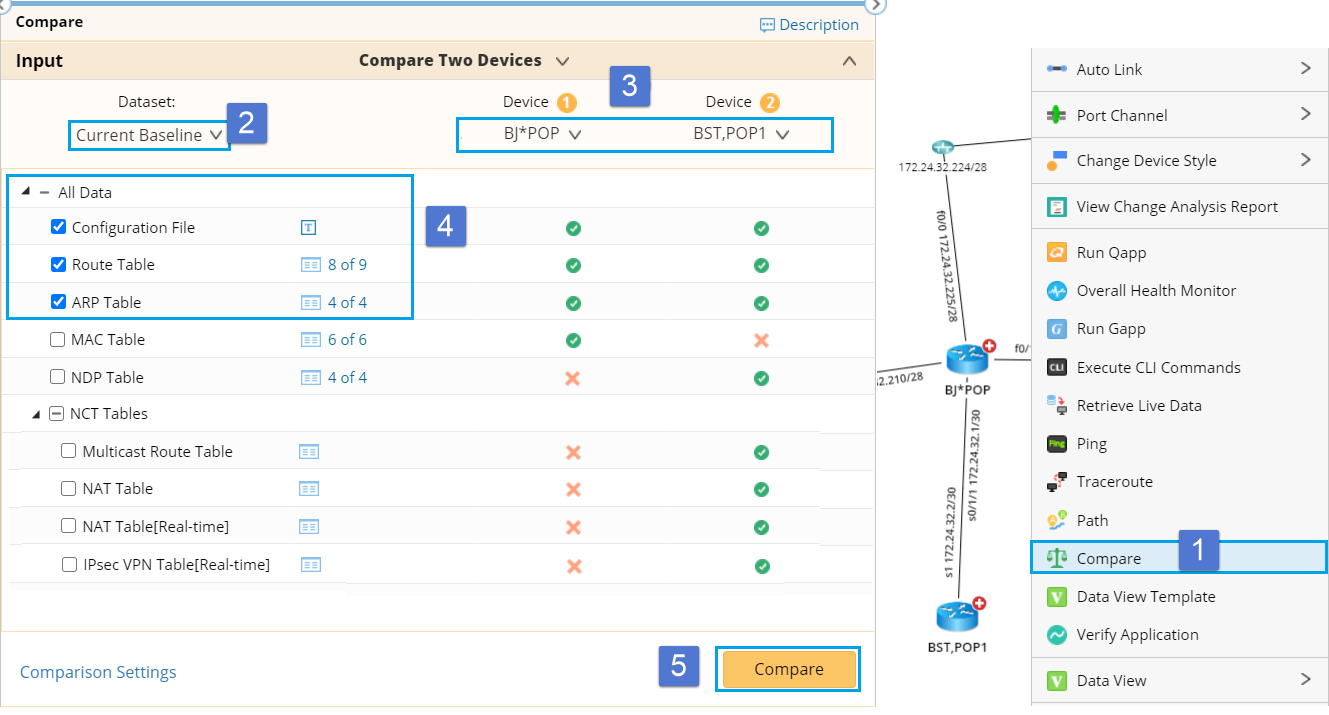 Tip: You can select sub items under each data type for comparison. For example, selected parser variables of configuration files and CLI commands, selected columns of data tables, or selected sub tables of data tables and NCTs.