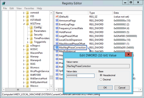 2)Double-click the MaxNegPhaseCorrection parameter to enter FFFFFFFF (4294967295 for decimal number) in the Value data field, and then click OK.