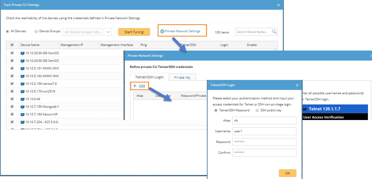and select Private CLI Settings, then add private Telnet/SSH login credentials and tune the target devices.