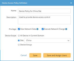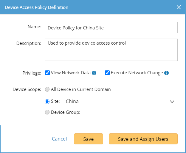 Tip: You can also assign users on the Share Policy tab, or apply the policy to users when adding users in the System Management page. If a defined policy hasn't been assigned to any user, all users do not have the two privileges: View Network Data and Execute Network Change.