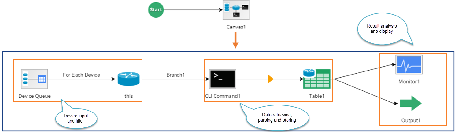 A Canvas contains an independent workflow from retrieving device data to analyzing data to outputting results. Canvas consists of multiple nodes and their relations as well as functions are illustrated as follows: