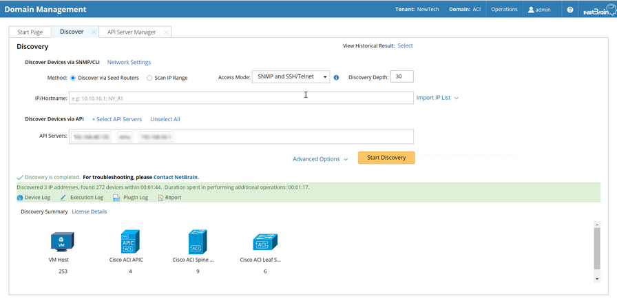 Note: The SDN discovery only retrieves basic data of your network and builds L3 topology. After the discovery, you need to execute a benchmark task to retrieve all data and build all components, including visual spaces and data views. See Auto-Updating ACI Data in NetBrain through Benchmark for details.