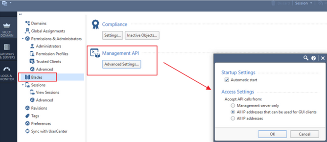 2.Enable API access to accept API calls from your NetBrain Front Server. Go to Blades > Management API > Advanced Settings > Access Settings, and select the All IP addresses or All IP addresses that can be used for GUI clients option.