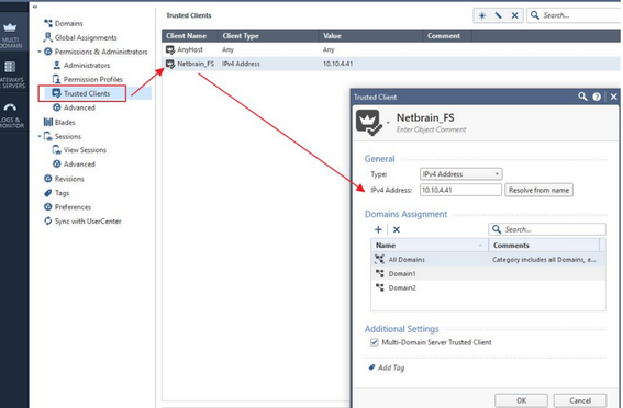 Note: If you select the All IP address that can be used for GUI clients option, add the IP address of NetBrain front server to the Trusted Clients as follows: