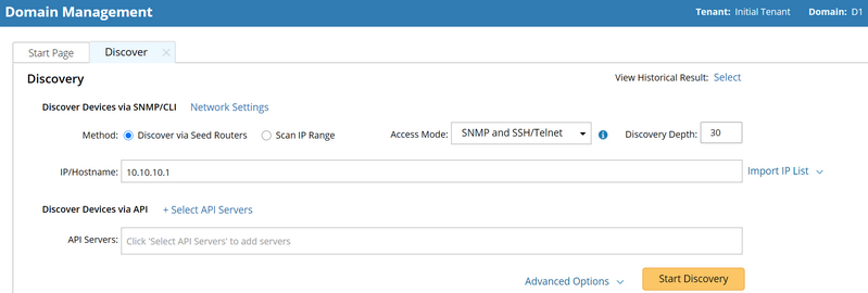 A seed router is the starting point where the discovery begins. With the seed router method, all the discovered neighbor devices will be treated as new seeds, until all devices matching the defined Discovery Depths are discovered. The system enables you to discover all the neighbor devices from the route tables, NDP tables, and SNMP routing protocol neighbors.