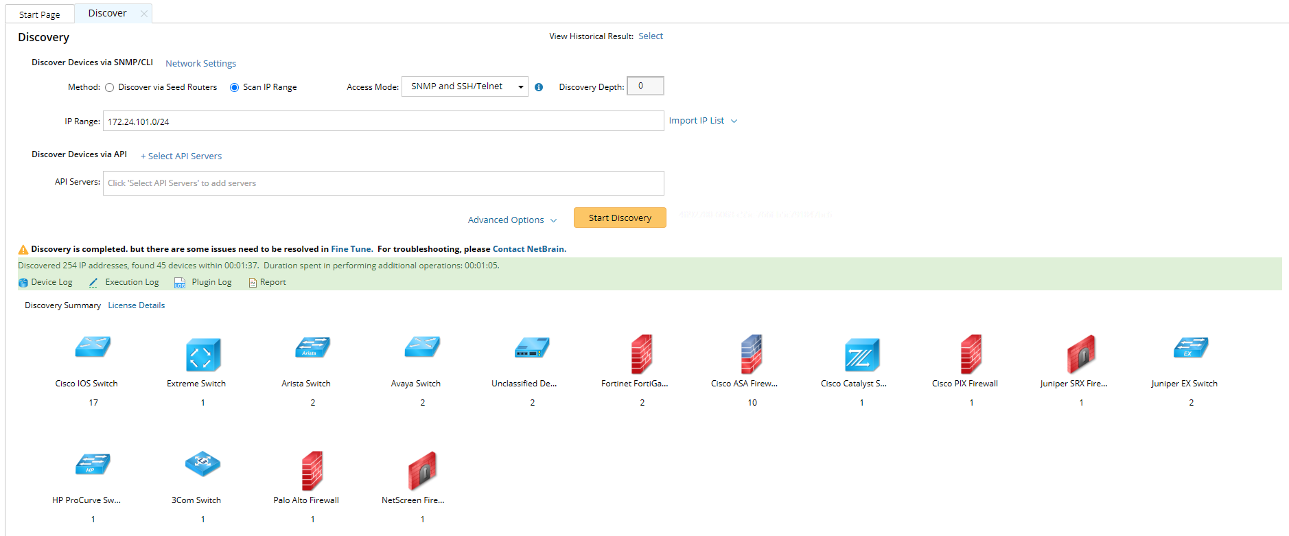 Note: Before discovering your network devices, you need to make sure that the connections between NetBrain Front Servers and your live network are working, and all available credentials are configured in the Network Settings to access your devices.