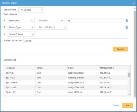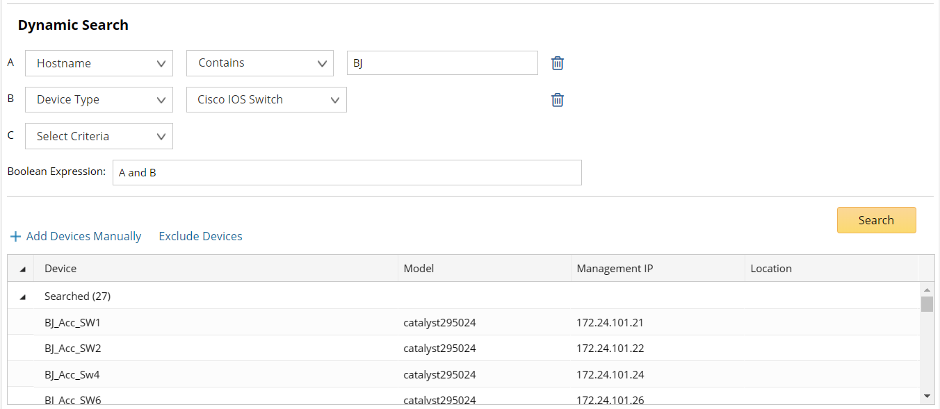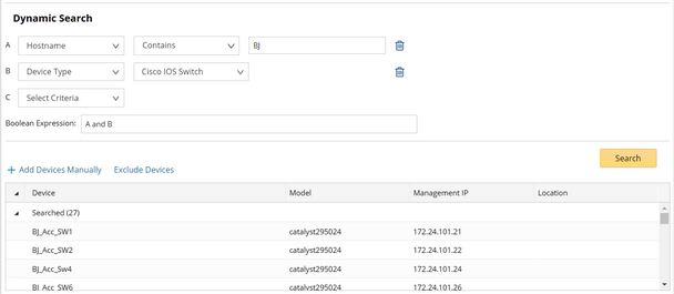 1.Define one criterion or multiple criteria to filter devices. As soon as a criterion is added, the Boolean expression becomes A and B, A and B and C and so on. You can manually change and to or if required.