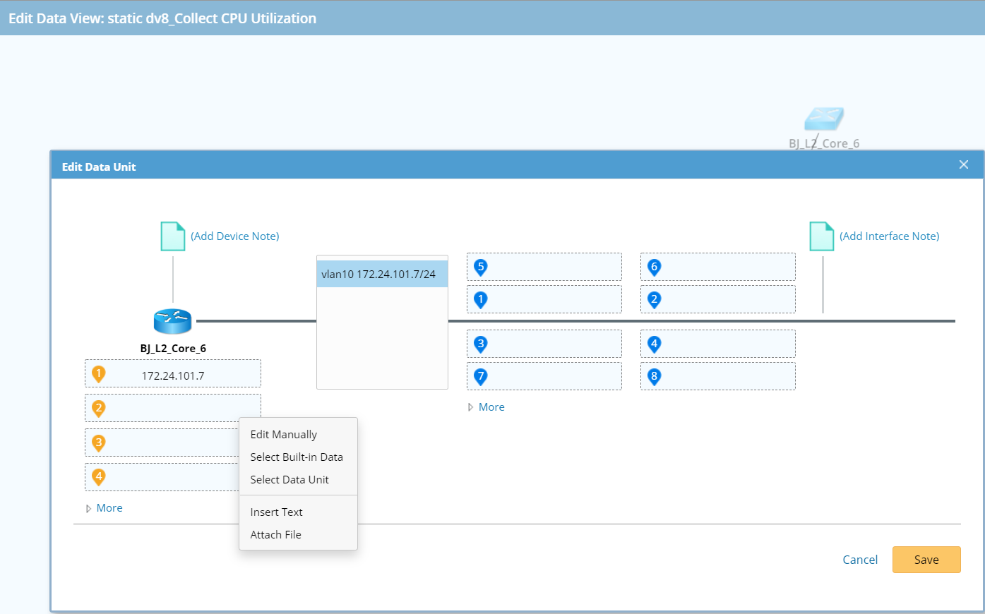 3.In the editing mode, click the device BJ_L2_Core_6. The existing device data units are displayed in the corresponding positions.