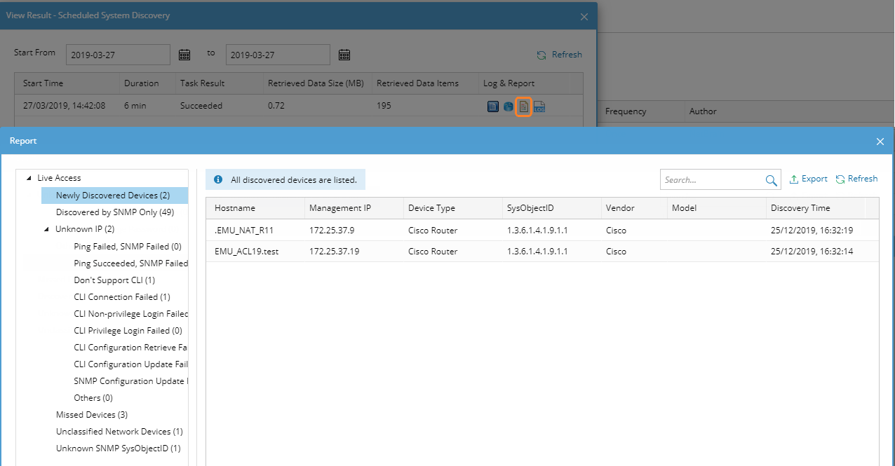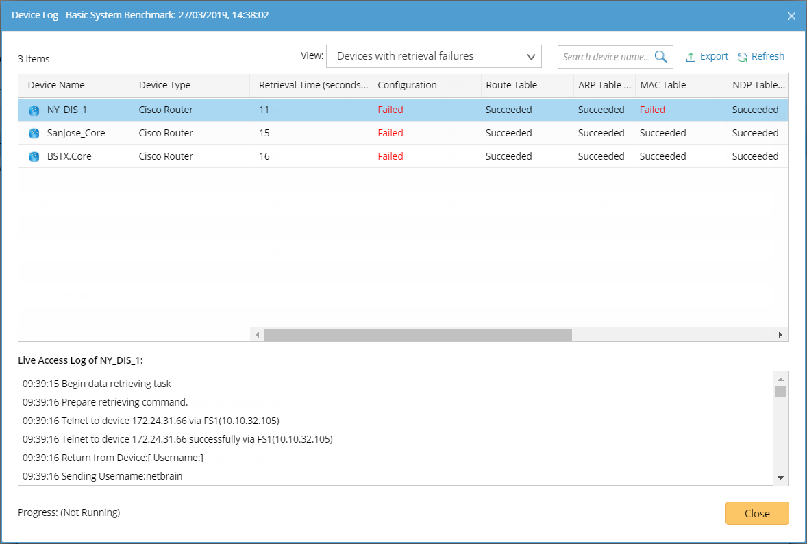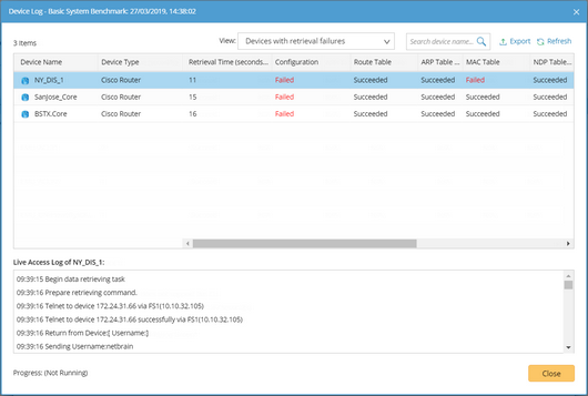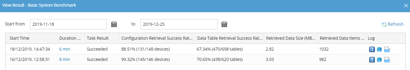 4.In the following dialog, the Configuration Retrieval Success Rate reflects how many devices are qualified and can be retrieved data successfully during the task. Select the log type to view in the Log column.