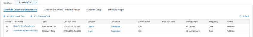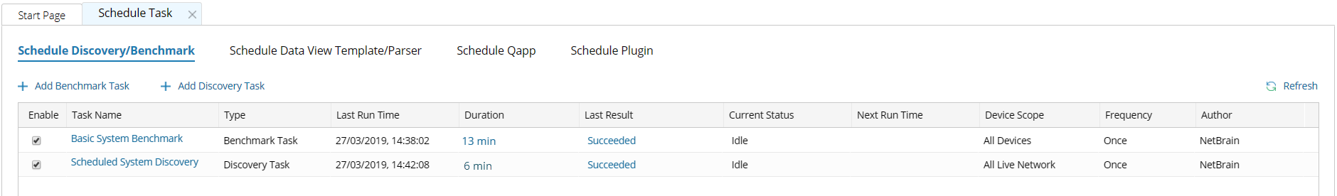 Tip: You can view the latest execution result of all benchmark tasks from the Last Result column. To view the detailed latest execution log of a benchmark task, click the hyperlink (such as Succeeded) in its Last Result column.