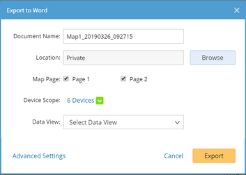 Tip: Click Advanced Settings to customize the Word template (such as logo, author, and company name) and the content contained in the document. See Content Settings for Exporting Map for more details.
