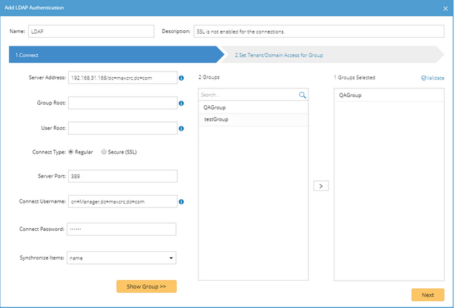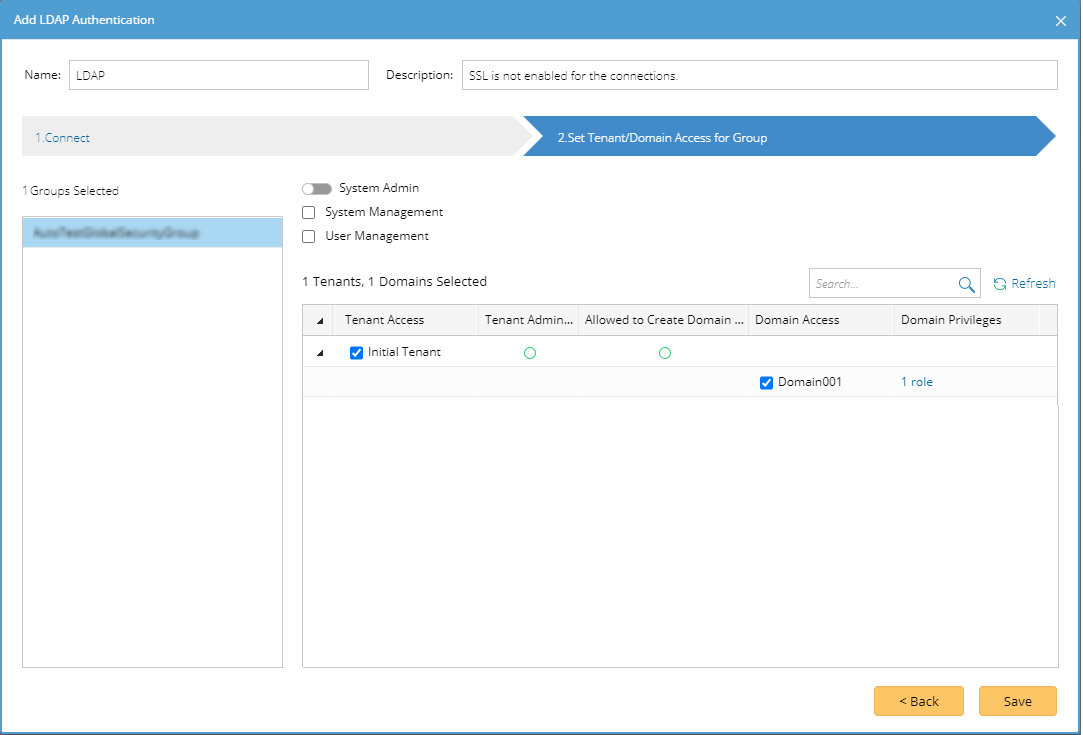 3.Click Add LDAP Authentication. A Wizard is opened to guide you through the steps to connect to the LDAP server and configure the tenant or domain access privileges for the imported user accounts.