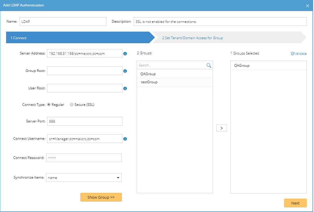 3)Click Show Group to find available user groups from the LDAP server. All matched groups are listed in the Groups pane.