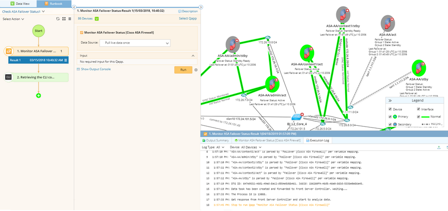 3.In the Monitor ASA Failover Status Qapp node, add target devices, select Pull live data once in the Data Source area and click Run. The active and standby status of ASA firewalls is displayed on the map. According to the legend, the ASA-AA/act firewall becomes secondary but the ASA-AA/stby firewall becomes primary. You can click Show Output Console > Execution Log to view the detailed log regarding how the Qapp retrieves data from target devices.
