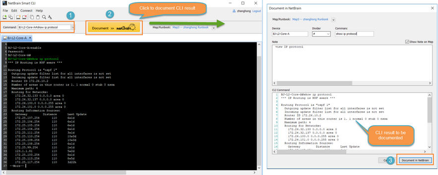 Tip: You can also select some specific command results and click the Note icon to open the Document in NetBrain window and add the selected results as a note. The Smart CLI can recognize the CLI command that the selected CLI results belong to and automatically load the CLI command and its entire results to the corresponding fields.