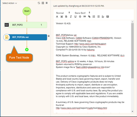 If the device cannot be found in the specified domain or the CLI command to document is not supported by the system, you can document the command as a text in the runbook. The runbook will generate a Pure Text node to save the command result.