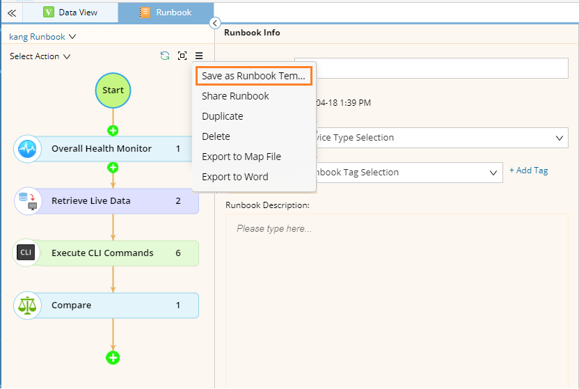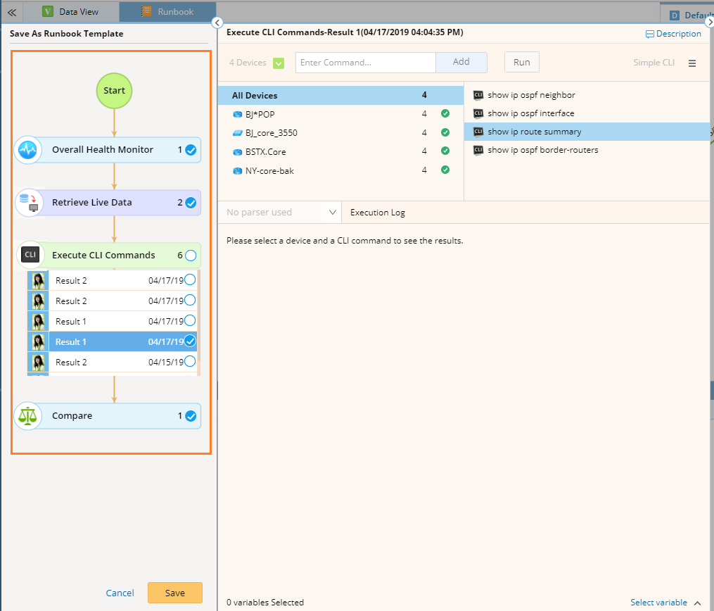 To share knowledge with junior users, you can save a golden runbook as a runbook template. When saving a runbook to a template, you can select which result to be saved. Only the selected action results of the action nodes will be saved to the template as the inputs. The target devices and execution results of these action nodes will be discarded.