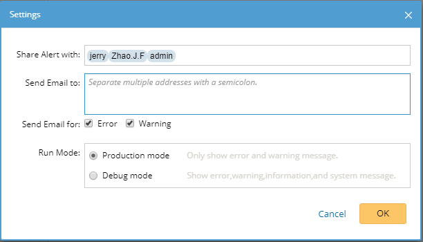 ▪Production — only show alerts only in the Output Console, including both error and warning messages. ▪Debug — show all events in the Output Console, including error, warning, information and system messages. |