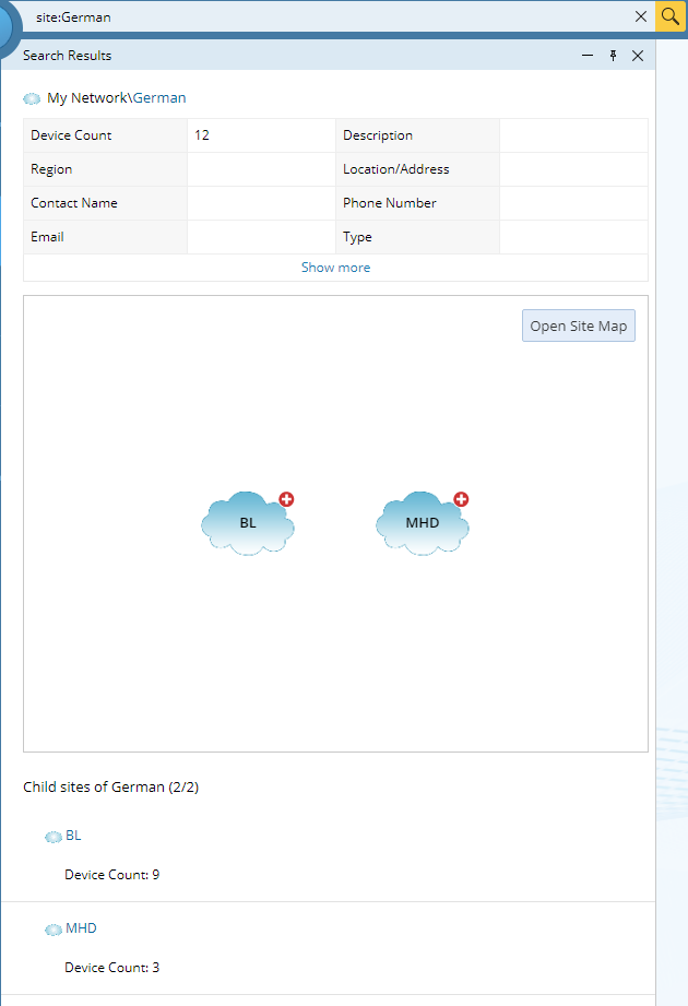 icon or press the Enter key on your keyboard to start searching. The corresponding site map is shown and all child sites or devices under the site are listed.