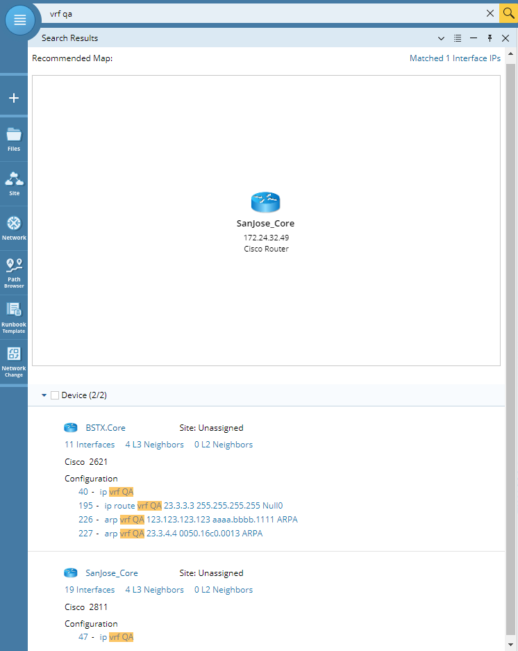 icon or press the Enter key on your keyboard to start searching. Devices and interfaces matching with the VRF are diagrammed and auto-linked on a preview map, including their neighbors.