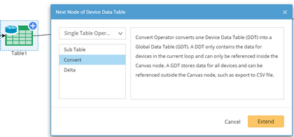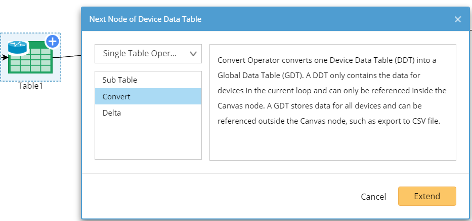 2.Select Single Table Operator > Convert from the drop-down menu and click Extend. Another table node (Table2 in this sample) is created after the Convert node, and no settings are required.