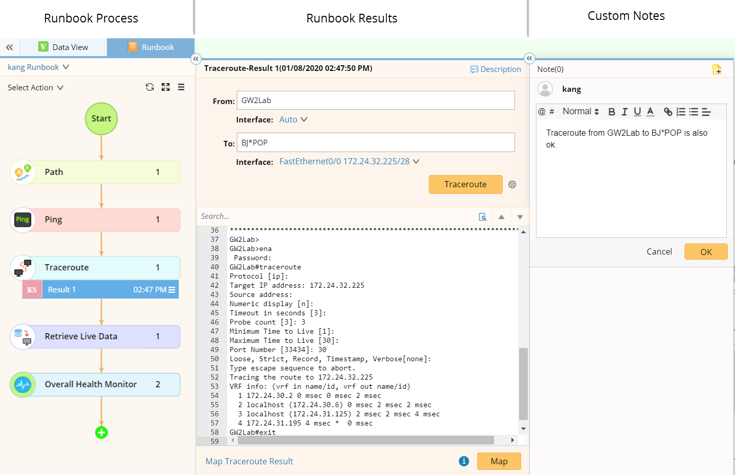 For example, end users run Qapps, execute CLI commands, or use Ping/Traceroute to troubleshoot a problematic area. These actions are instantly recorded in a Personal Runbook, and each action can be annotated with thoughts or analysis to document the diagnosis process.
