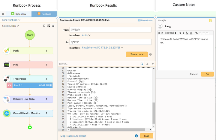 For example, Tier 1 engineers execute CLI commands to troubleshoot problematic devices on a map, document the diagnosis and escalate the issue by mentioning next-level users in the runbook. Tier 2 engineers re-execute the runbook, and continue to add a Compare node to evaluate data changes between the two CLI outputs, and then escalate to Tier 3. Each Tier can continue to build on top of what has been done previously by checking analysis results and notes.