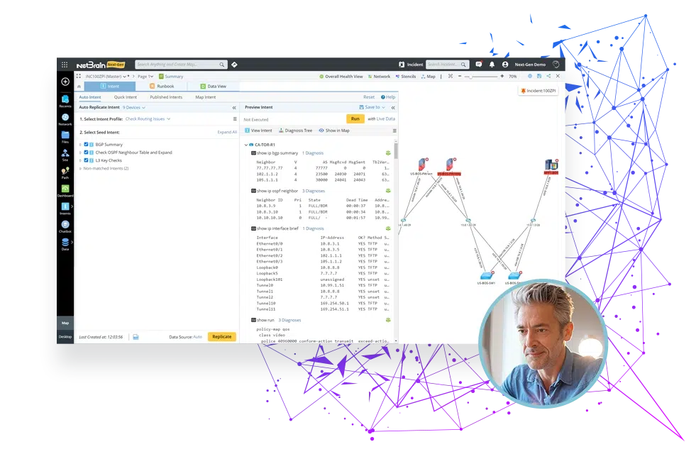 Beginning with a live, continuously updated model of your multi-vendor network, incorporating real-time configurations, traffic forwarding, and device states, NetBrain adds application-aware Network Intents—the desired behavior of your business infrastructure—for a true Digital Twin that supports live automated assessments and diagnoses of your network’s performance and health across physical, virtual, and cloud environments.